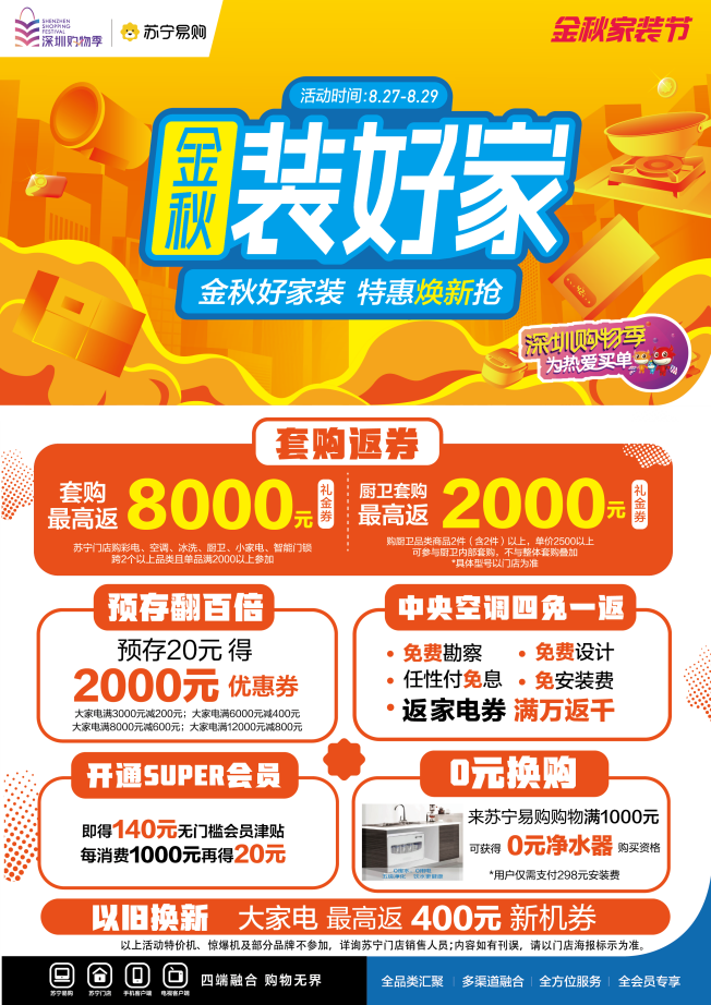 而9月9日到9月12日期间,苏宁易购将开启涉及全品类的金秋家装节,并且将会联合海信一起开启909嗨购盛典,届时不仅会有大牌汇聚,福利补贴,还将会有家装品牌共同加入,联手提供一站式装修解决方案,一同为消费者避开家装过程中的那些坑。同时深圳购物季也在持续进行中,苏宁易购作为指定电商平台,为深圳市提供了一亿元的消费补贴,消费者在深圳市苏宁易购门店参与以旧换新活动,大家电产品最高可以补贴400元,手机产品最高可以补贴1600元,电脑产品最高享受88折优惠。另外苏宁易购还开设了“圳品专区”,里面汇聚深圳本土大牌产品,折扣低至五折起。