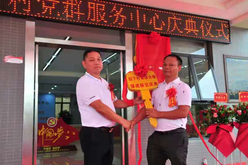 在落成典礼中,深圳安宏基控股集团有限公司彭康辉董事将大楼办公钥匙移交给硁下村党支部书记彭志康。村支书彭志康、五云镇慈善会会长彭志响一起赠牌匾给深圳安宏基控股集团有限公司彭康辉董事。