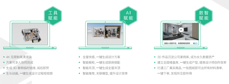 针对这一痛点,图满意渗透了用户从灵感搜集、量房签约到施工选材的全流程,为装企提供从获客到签单的全链路赋能。同时,图满意正在打造集楼盘库、案例库、方案库与商品库于一体的智能设计系统,搭建图满意场景化销售平台以及运营体系,助力装企实现一站式销售。