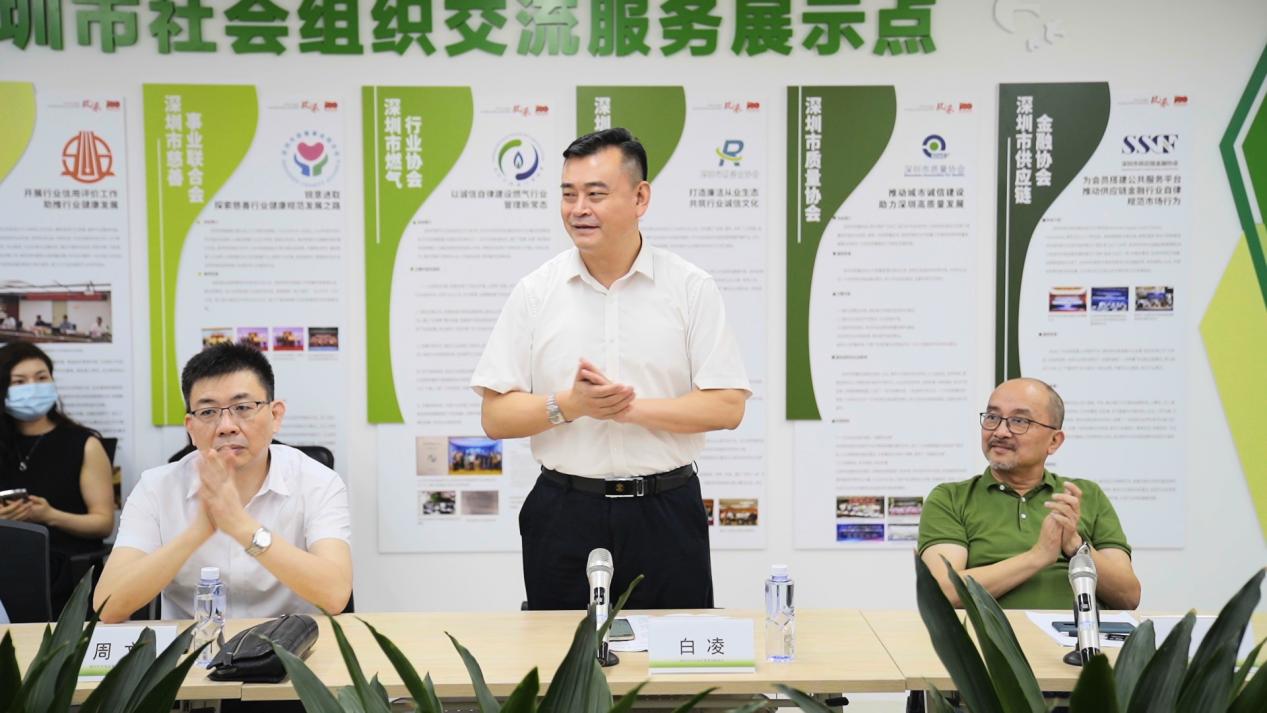 深圳市社会组织管理局副局长白凌对深圳市社会组织交流服务展示点“诚信建设领域”的揭牌表示衷心的祝贺,并号召社会组织其他领域也都要有诚信之心,这是为社会服务的本心。
