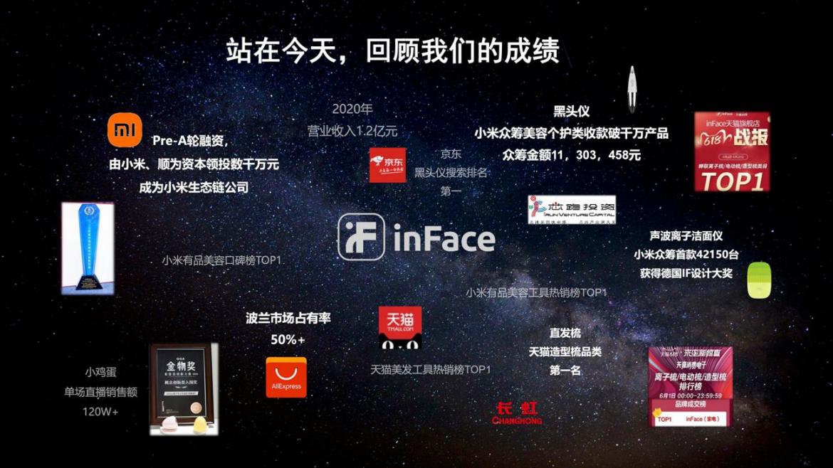 据了解, inFace创立于2017年6月21日,经过近1年筹备,2018-2020年完成了第一个“三年计划”,即实现成为行业有代表和开创性“产品型公司”的战略目标。在这期间,inFace发布原创产品12款+,年营收超1亿元,同时完成由小米集团、顺为资本领投的数千万元Pre-A轮融资,正式加入小米生态链。在小米有品、天猫和京东等国内主流电商平台上,核心类目例如洁面仪、黑头仪、直发梳、美肤仪和美容仪等产品,inFace都是TOP级商家。