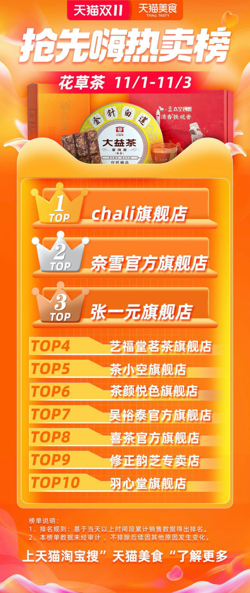 今年“双11”电商购物节比往年更早开启,10月20日晚8点便拉开序幕,奈雪的茶随之推出满减、秒杀等多项优惠活动。奈雪此次双11迎来开门红,数据显示,11月1日凌晨开售后仅10分钟,奈雪的茶的销售总额便突破去年全天。11月1日-3日,伴随着茶礼盒等产品的热销,奈雪跻身花草茶销售额排行榜TOP2。