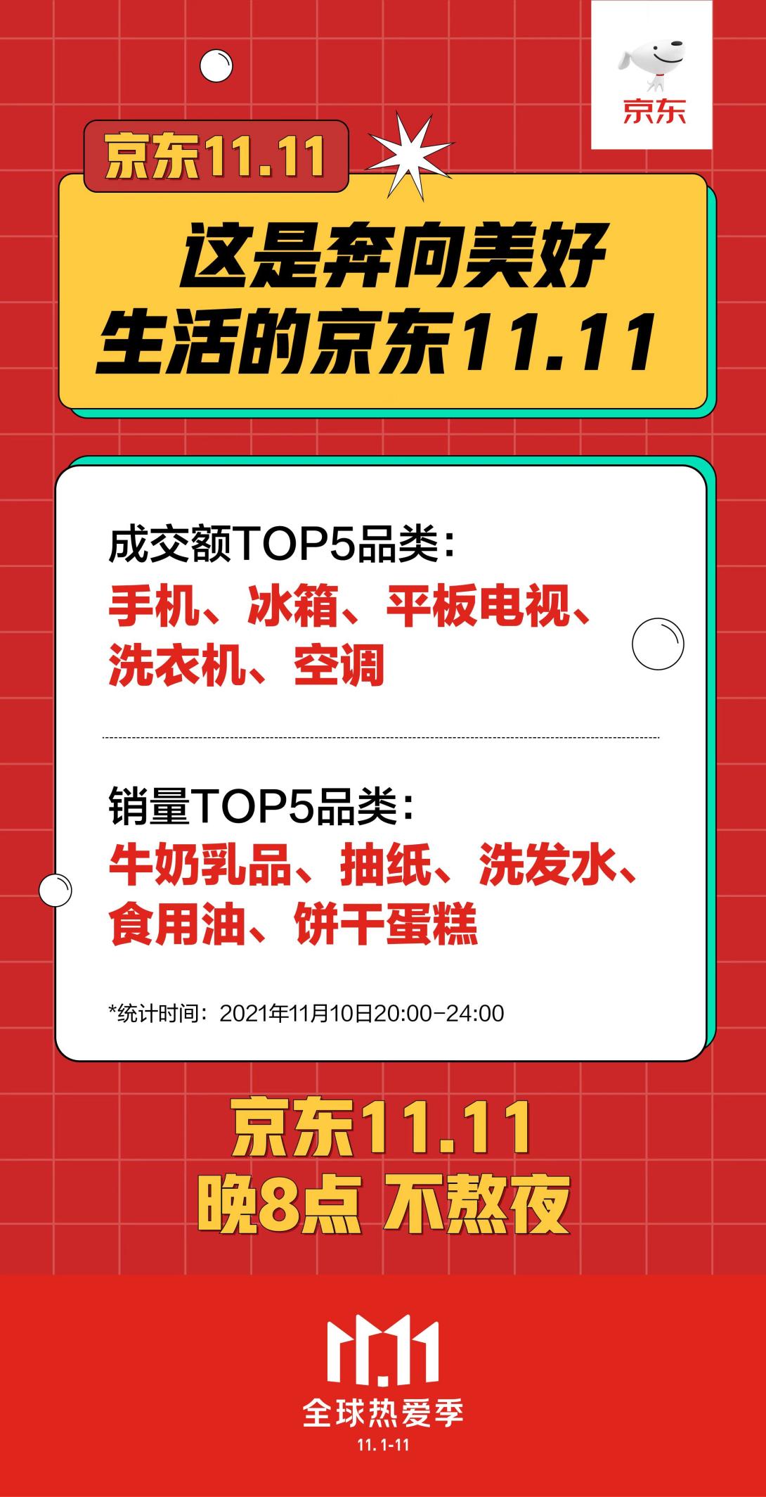 从10日晚8点到11日0点短短4小时内,可以看到消费者对美好生活的向往和对消费升级的追求。其中成交额TOP5品类:手机、冰箱、平板电视、洗衣机、空调;销量TOP5品类:牛奶乳品、抽纸、洗发水、食用油、饼干蛋糕。