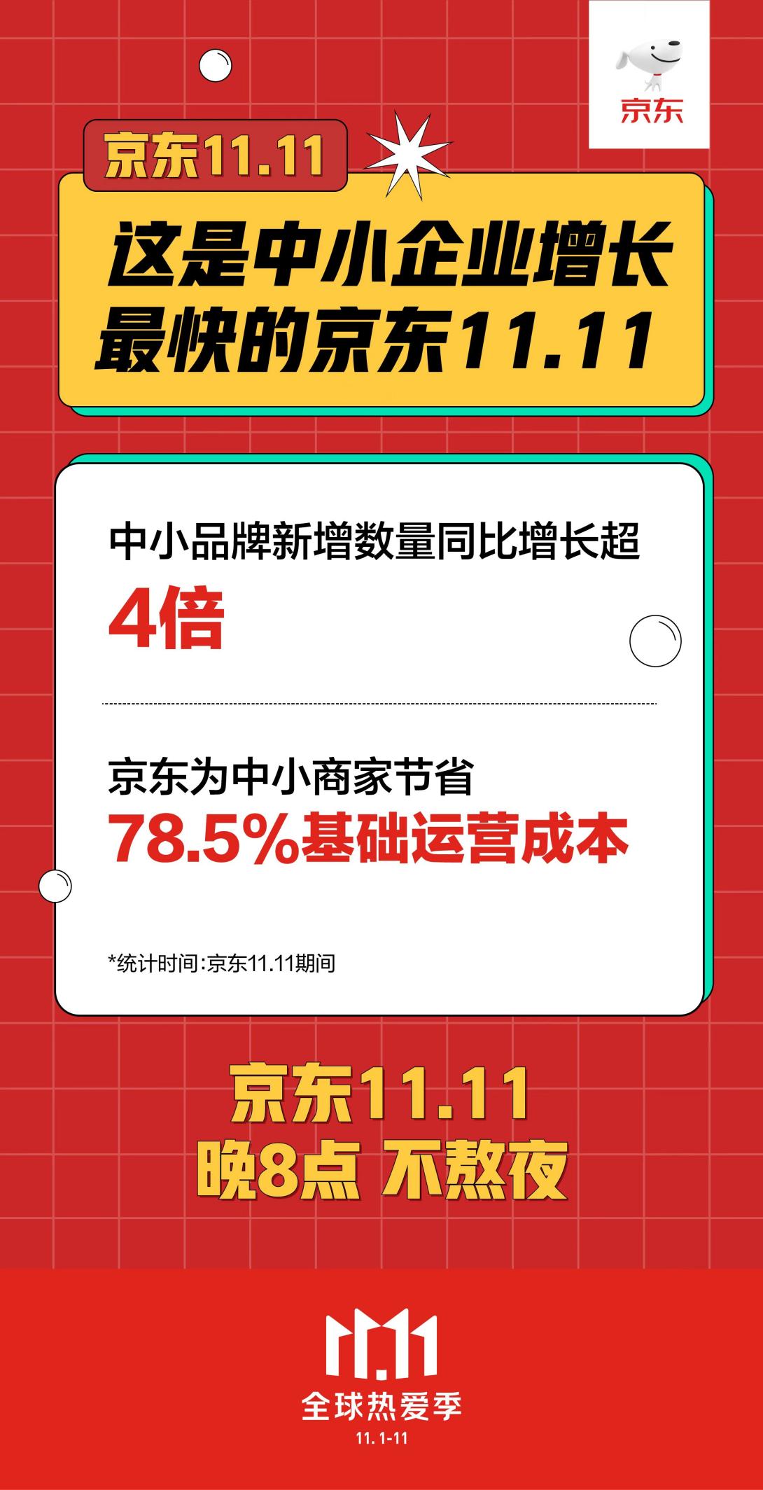 这是中小企业成长最快的京东11.11,中小品牌新增数量同比增长超4倍,京东为中小商家节省78.5%的基础运营成本。以气弹茶饮料为主打的“果子熟了”品牌为例,参与京东小魔方新品日的1小时内,成交额便同比提升500%,访客数环比提升500倍。