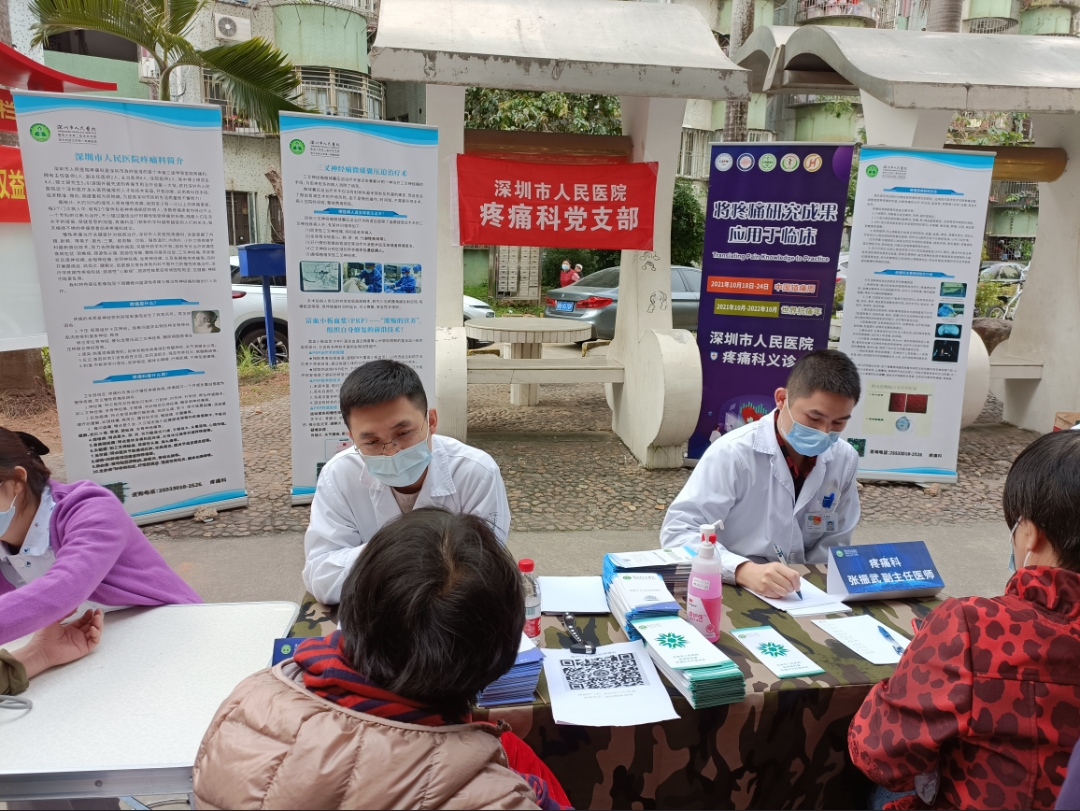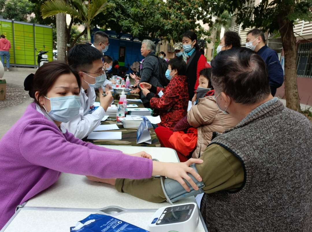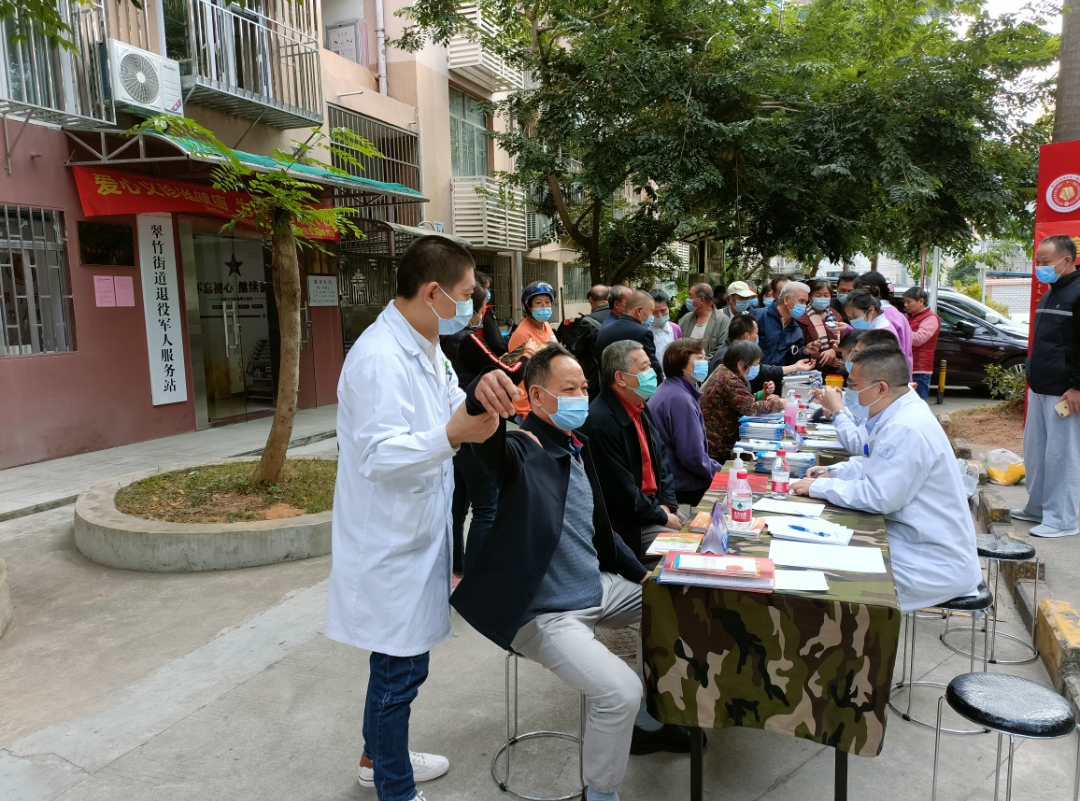 12月19日上午,深圳市人民医院疼痛科11名专家与护士携带血压计、血糖仪、听诊器、理疗仪等仪器到街道退役军人服务站开展“爱心义诊送健康,为民服务暖人心”关爱退役军人义诊活动。为防范疫情风险,服务站将健康服务分区域并安排工作人员查验健康码、行程码、测体温,参与人员须佩戴口罩方能进入活动现场。在服务站门口通风处设置血糖与血压测量处、专家医生坐诊处,在老兵活动室开展健康知识讲座,在党建活动室和老兵谈心室开展身体理疗服务。所有服务同时开展,退役军人和居民自主决定参与顺序,避免扎堆。