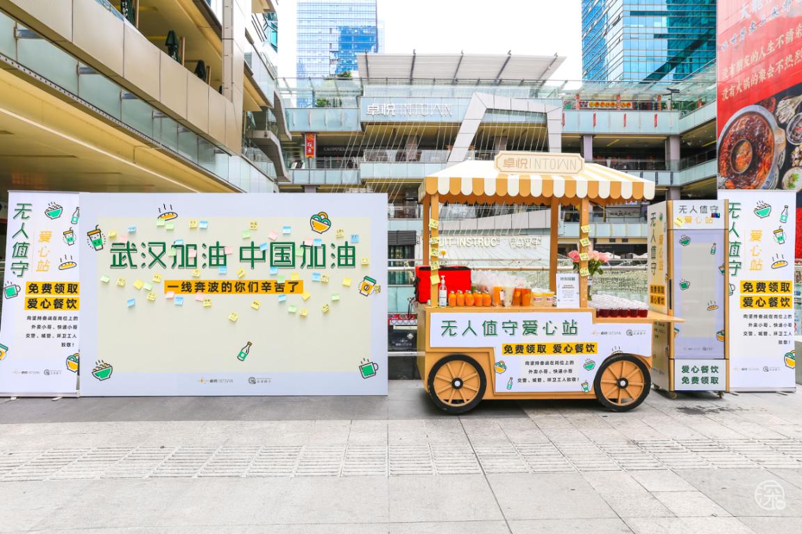 3月3日至3月8日卓悦INTOWN在街头专设了一个”无人值守爱心站”,用爱心餐车上放满了食物冷/热饮,专门免费赠送给快递、外卖小哥、环卫工人、警察、城管等一线奔波的人员。