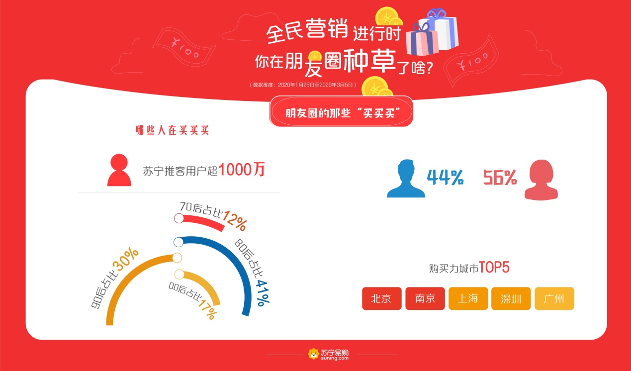 近日,苏宁易购发布全民营销大数据,2020年1月25日至3月5日,苏宁推客买家数和卖家数分别突破千万、百万大关,80后成为朋友圈买、卖“双主力”,粮油休食、个护家清、生鲜等产品成为最受欢迎的消费品类。