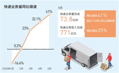 5月我国快递业务量完成73.8亿件,同比增长41%,创2018年2月以来新高。