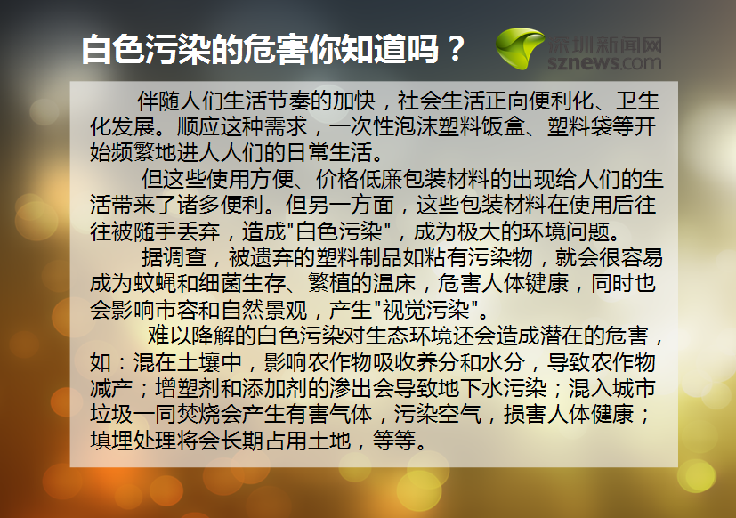 伴随人们生活节奏的加快,社会生活正向便利化、卫生化发展。顺应这种需求,一次性泡沫塑料饭盒、塑料袋等开始频繁地进人人们的日常生活。