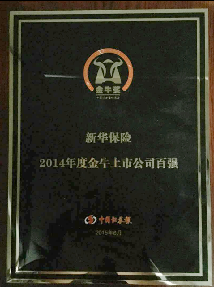 2015年6月,中国证券报第17届(2014年度)上市公司金牛奖隆重揭晓,新华保险荣获“金牛上市公司百强”奖项,这代表了资本市场以及社会各界对新华保险在公司治理、信息披露、投资者关系等方面工作的高度认可。