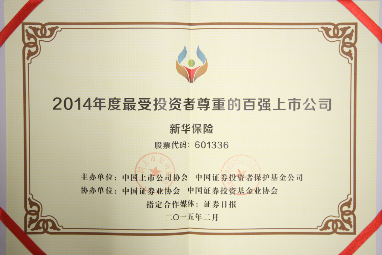 2015年2月,在中国上市公司协会、中国证券投资者保护基金公司主办,中国证券业协会、中国证券投资基金业协会协办的评选中,新华保险获得2014年度最受投资者尊重的百强上市公司。