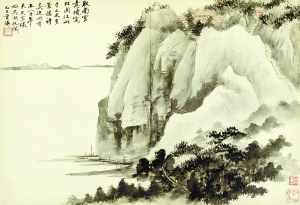吴湖帆在所藏米芾《多景楼诗帖》册首补绘的《北固山江山图》(局部)