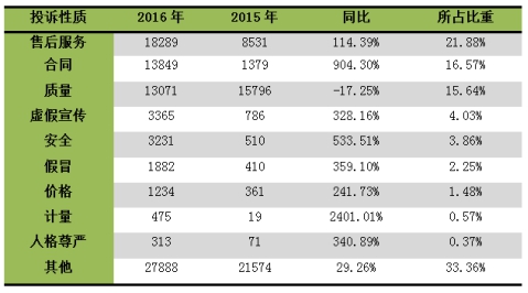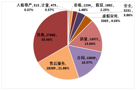 从投诉性质看,2016年受理的投诉中,反映最突出的是售后服务问题,18289宗,占21.88%;其次是合同问题,13849宗,占16.57%;再就是质量问题,13071宗,占15.64%;三大性质类别的投诉比率都超过了10%。虚假宣传问题、安全以及假冒问题,分别有3365宗、3231宗和1882宗,所占比率都低于5%。如图3所示。