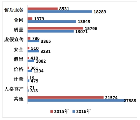 由于投诉总量的激增,相对于2015年,除质量问题之外,其他各类的投诉问题都增加,增加的幅度大多超过了1倍。如表3,图4所示。