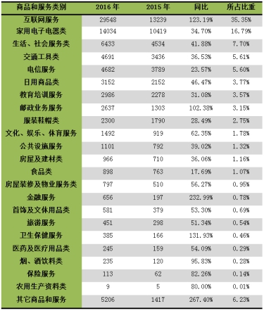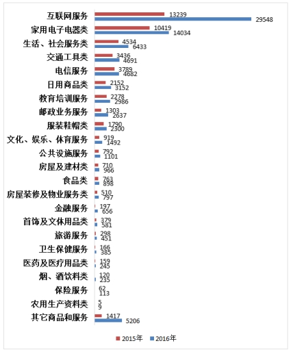 2016年商品和服务二十三大类投诉,相对2015年数量均有所增长。互联网服务、家用电子电器类、生活社会服务类、交通工具、电信服务类五大类投诉量居前,分别占投诉总量的35.35%、16.79%、7.70%、5.61%和5.60%。