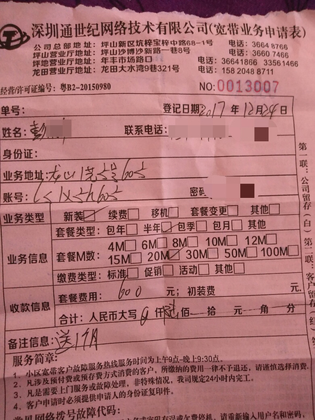 在深圳通世纪网络技术有限公司办理了一个宽带,我是在坪山上班,当时办理的时候特别问了我说要深圳网络,谁知道我交了钱之后给我拉的是惠州的宽带网络,而且一到晚上网络很不稳定,网络只有我一个人用,下载速度经常只有十几kb,我办理的是20兆的光纤宽带,找他们退钱客服说交的钱是不可能退的,一直只有这一句话,叫他们把网络卡解决一下,也只是一句话,网络故障我们在修复。