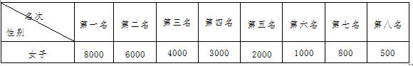 根据枪声计时成绩录取女子第一名至第五十名运动员现场颁发获奖证书,前八名并分别获得奖金(单位:人民币元),前三名另外颁发奖杯一座、完赛奖牌一枚、领奖服装一套。