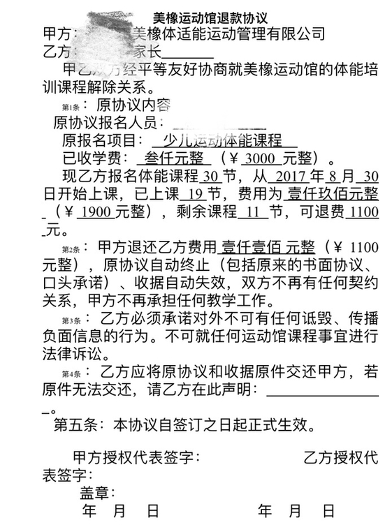 我于2017年8月30日续报深圳市美橡体适能运动管理有限公司体能课程,已经是第三次报了,每次3000元,30节课,都是与教练微信沟通与转帐。2018年1月10日收到该公司通知说结束体能馆的业务,不再营业,说统一给我们退剩余的课程费用,12号加了该公司财务微信沟通相关退费事宜,财务说统计好在一周内统一给我们退费,19号收到财务信息,说可以退回1100元,还说几天后可以退款,并说好通过微信退还(当时压根没有说签协议后再退),一周拖一周,在23号忽然发微信来通知说要求去签协议才退款,当天又进行了协商,因为我带俩小孩实在抽不出时间去他们公司,能否把协议发到我邮箱确认,财务说先与他老板汇报后第二天给回复,但第二天也没有收到任何回复,然后又问财务协议发过来了吗?财务二话没说就把协议通过微信发给我,当时想想签了就算了,但细看第三、四条真的很难让人接受,内容详见附件1。我们交费的时候什么协议、收据对方都没给,现在退钱就要求我们签协议,而且是霸王条款,还叫我写上“我自愿终止培训课程”,老天哪是我自愿的,真是有种迫良为猖的感觉,还有第三条,也太污辱人格了,再次和他们友好协商希望把协议第三条改了,对方视而不见,不理不睬,也不积极回应。