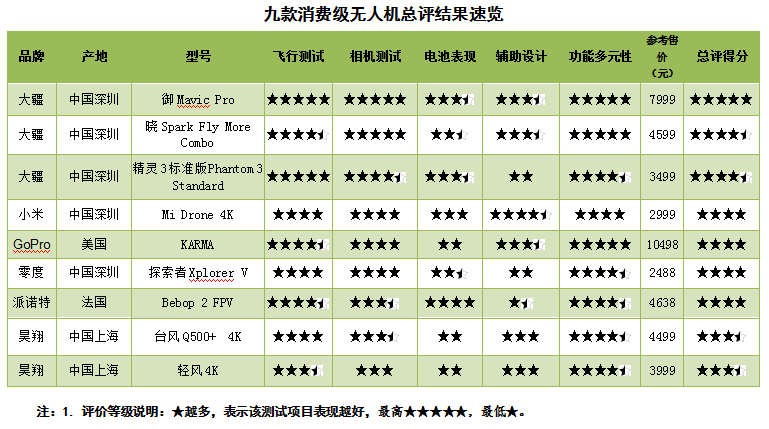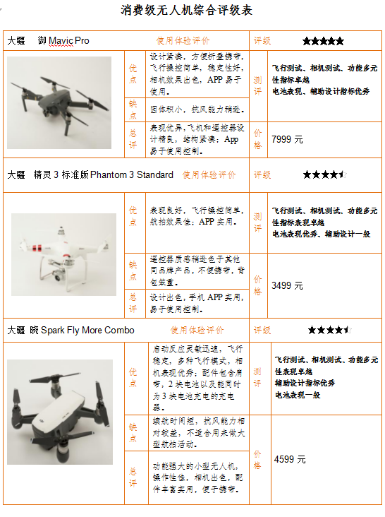 其中大疆的“御Mavic Pro”和“晓Spark Fly More Combo”表现出众,获得5分满分。