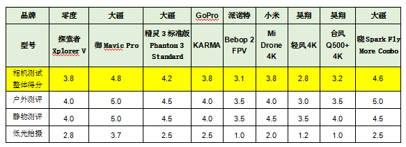 9款无人机拍摄能力参差不齐,大疆的“御Mavic Pro”和“晓Spark Fly More Combo”在相机测试上整体表现优秀,分别获4.8分和4.6分。昊翔“轻风4k”得分只有2.8分,表现欠佳。详见下表。
