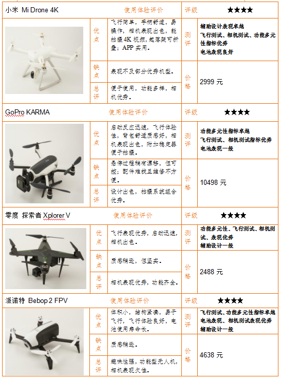 总评:小米“Mi Drone 4K”辅助设计表现最好,获评4.5分。派诺特“Bebop 2 FPV”和零度“探索者Xplorer V”表现较差,仅获评1.3分和1.8分。详见下表。