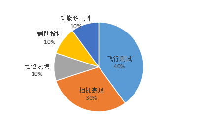 (二)单项指标优势明显。三款产品的飞行测试、相机测试、功能多样性三个维度的测试数据均优于其他品牌产品。