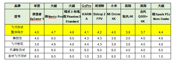 自动飞行测试:零度“探索者Xplorer V”、大疆的“御Mavic Pro”、“精灵3标准版Phantom 3 Standard”,小米“Mi Drone 4K”4款无人机获满分