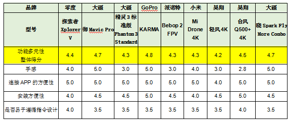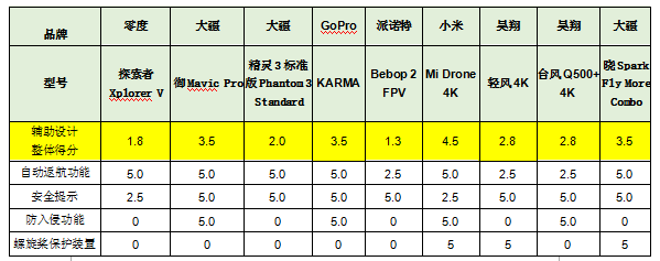 总评:小米“Mi Drone 4K”辅助设计表现最好,获评4.5分。派诺特“Bebop 2 FPV”和零度“探索者Xplorer V”表现较差,仅获评1.3分和1.8分。详见下表。