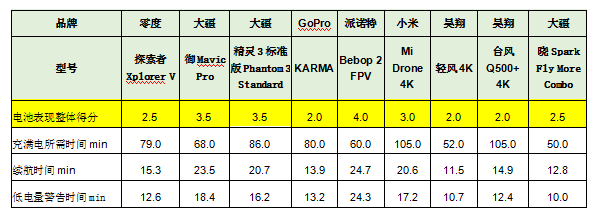御Mavic Pro”和“精灵3标准版Phantom 3 Standard”,充电时间较短,续航时间较长,表现较好,获评3.5分。