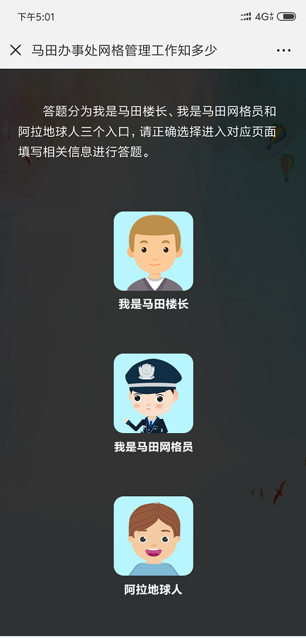 随着当前光明新区经济和社会的飞速发展,网格巡查管理工作环境日趋复杂。为此,马田办事处以社区网格化为抓手,积极带领业主、楼长、住户主动参与到楼栋的管理和社区的建设,使他们从小“家”迈向大“家”,家家参与、人人行动,让安全文明新风形成常态,营造生机勃勃、欣欣向荣的社会氛围,在马田辖区打造共建共治共享社会治理格局。“马田办事处网格管理工作知多少”线上有奖竞答活动,由光明新区马田办事处主办,马田社区网格管理中心承办。此次答题活动自8月15日9点启动,截止至8月19日23点59分,为期5天。答题分为“我是网格员”入口、“我是楼长”入口和“阿拉地球人”三个入口。通过楼长入口进入的用户,需输入马田辖区楼长身份证或港澳通行证号方可答题,网格员入口则需输入马田辖区网格员有效证件号码进入对应的答题页面。在每次答题时,答题系统将随机抽取10道题,用户须在120秒的时间内完成,答对8题以上即视为闯关成功,可获得一次抽奖机会,有机会获得100元、50元、10元、5元、2元不等的微信红包。