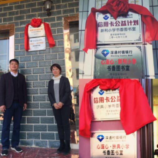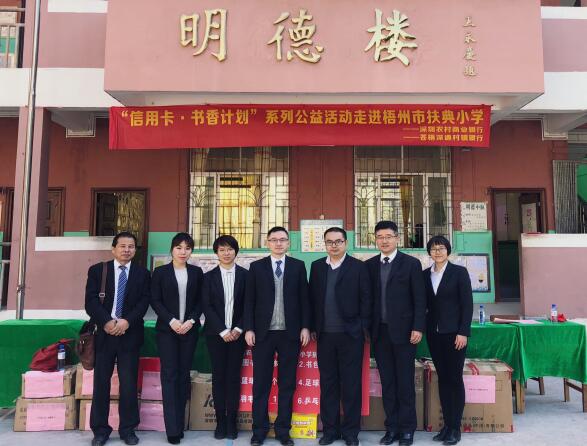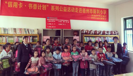 2017年,由深圳农商行发起的“信用卡公益计划·书香图书室”捐赠活动,深入走进广西壮族自治区的偏远山区,为当地较为贫困的扶典小学、新利小学、林旺小学和育才小学带来温暖和鼓励。本次活动共捐赠各类图书1899册、文体用品130套、书包590个、书桌书架椅子42套,有效地帮助这四所小学建设充实图书室,为孩子们创造良好的阅读环境,让更多孩子在阅读中滋养向上生长的力量。