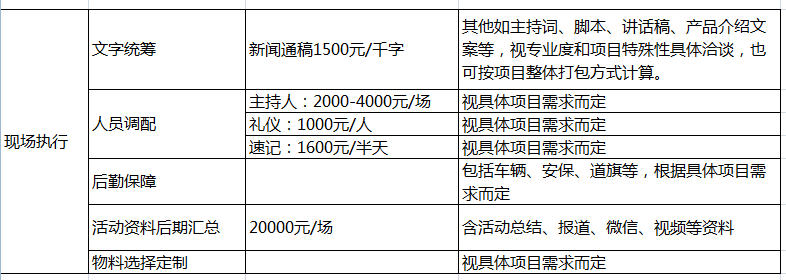 1、文字统筹:主要以新闻通稿为主,包括主持词、现场脚本、领导讲话稿、产品描述等。