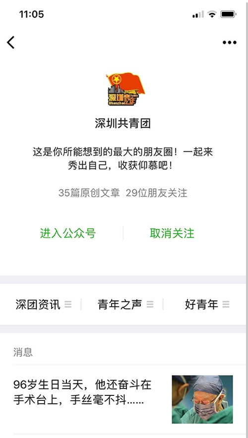 案例介绍:“深圳共青团”微信公众号于2013年开通,是全省最早开通的政务微信号。在近两年加大力度建设和推广后,粉丝数有了飞跃性的增长,推送阅读量和影响力也有了比较明显的提升。截至目前,累计推送1700余篇,平均阅读量1万以上,单篇最高阅读量达到36万,粉丝数90余万。目前,公众号影响力在全国地市级团委中排名前3,在全市政务新媒体中排名前5。在发布的内容上,主要关注时政安博(中国)、社会热点、政策解读等与青年息息相关、喜闻乐见的话题内容,弘扬爱国精神和时代精神,是深圳共青团联系、引导和服务青年的重要载体。