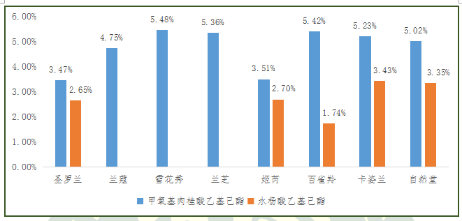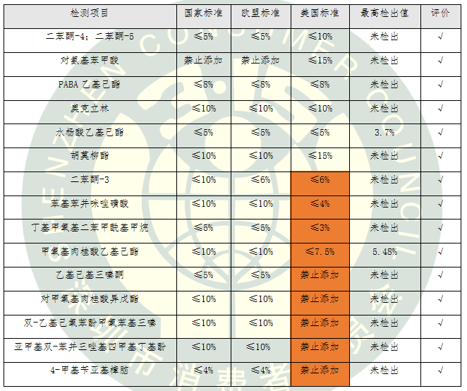 本次测评的8款气垫粉底有5款属于防晒类化妆品,3款属于非防晒类化妆品,均检出了一定量的化学防晒剂。检测结果显示:8款气垫粉底均未检出禁用的化学防晒剂,允许使用的检出值均在最严格的限量范围之内,并且化学防晒剂成分与批件及标签标识一致,不仅符合国家标准要求,也符合美国标准要求。