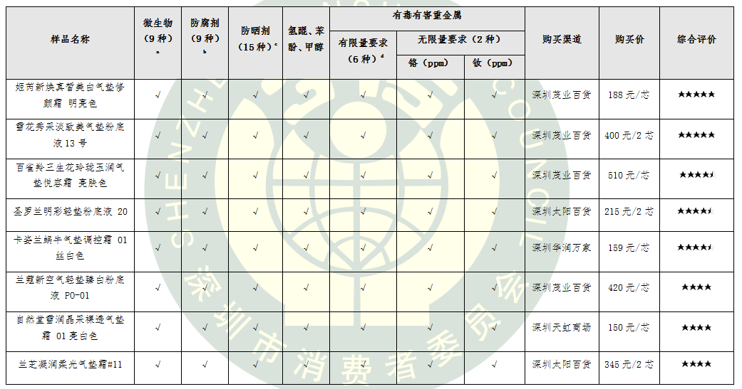 为给消费者提供科学合理的消费指引,深圳市消费者委员会联合福田区消费者委员会、宝安区消费者委员会委托深圳市品质消费研究院开展气垫粉底比较试验。本次比较试验委托第三方权威检测机构进行检测,对国内外8个知名品牌气垫粉底的安全性和感官性进行了比拼。
