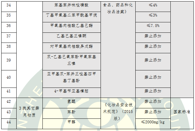 c.防晒剂(15种):苯基苯并咪唑磺酸、二苯酮 -4和二苯酮-5、对氨基苯甲酸、对甲氧基肉桂酸异戊酯、 PABA乙基己酯、丁基甲氧基二苯甲酰基甲烷、奥克立林、甲氧基肉桂酸乙基己酯、水杨酸乙基己酯、胡莫柳酯、乙基己基三嗪酮、亚甲基双 -苯并三唑基四甲基丁基酚、双 -乙基己氧苯酚甲氧苯基三嗪、二苯酮 -3、4-甲基苄亚基樟脑