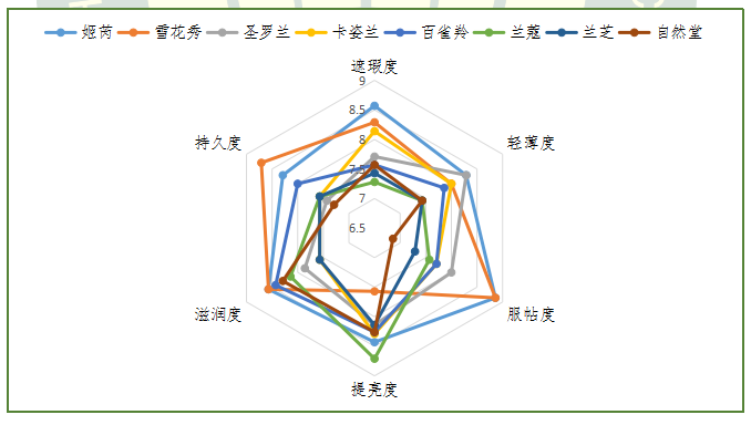 获得本次感官评价指标综合得分前三名的品牌为:姬芮、雪花秀和圣罗兰,得分分别为:8.44、8.22和7.91。8款产品在感官评价中均达到优良水平以上。