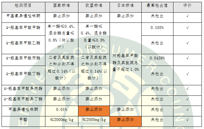表3.不同国家地区防腐剂标准要求比对及评价结果