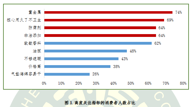 对于气垫粉底这类兼具BB/CC霜和粉底功效的新型彩妆产品,消费者最担心的问题是什么呢?项目调查数据显示,关注气垫粉底“重金属”问题的消费者占比高达74%,“担心气垫粉底用久了不卫生”的消费者占比为69%,还有64%的消费者关注“防腐剂”和“非法添加剂”问题。