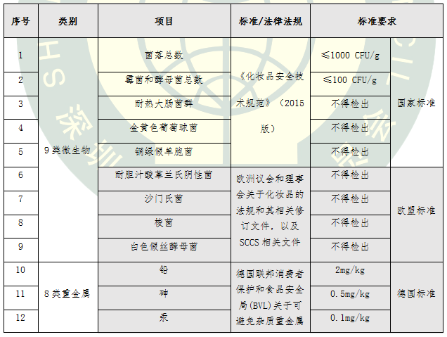 本次比较试验检测项目广泛征求了企业、业内专家和第三方检测机构的意见,不仅依据了现行国家标准,而且在国标基础上结合严格的欧盟标准 《欧盟化妆品法规EC1223/2009及其相关修订文件》、《欧盟消费者安全科学委员会(SCCS)关于化妆品安全的第九版指南》、德国联邦消费者保护和食品安全局(BVL)关于可避免杂质重金属限值的调查报告、美国《联邦食品、药品和化妆品法案》、日本厚生劳动省《药事法》以及其它相关标准、法规和技术文件的要求,采用国家标准检测方法、实验室通用方法等手段进行检测,从44项指标展开气垫粉底安全性品质大比拼,详细项目与要求见表1。