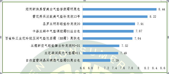 本次感官评价采用行业通行的测评方法,由9名具有气垫粉底使用经验,平均年龄在28岁的女性消费者,连续8天对高度关注的6个性能指标进行了测评,最终得到8个样品感官评价综合结果如下: