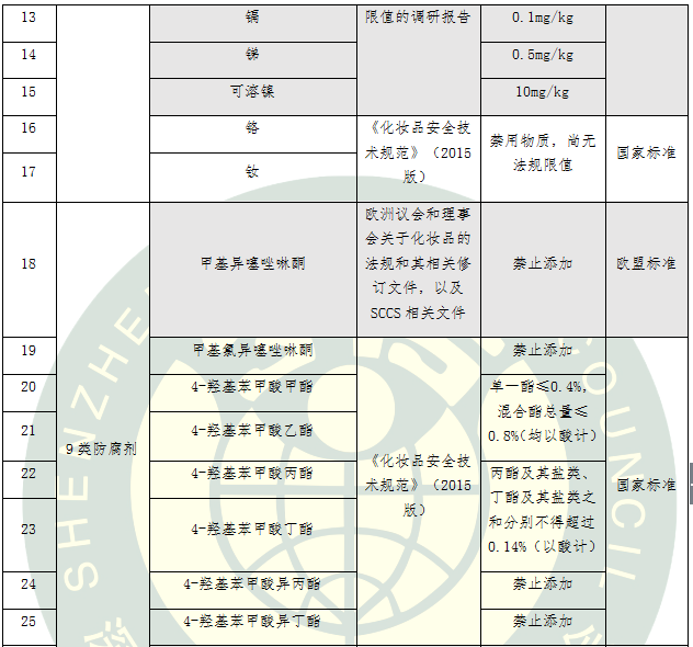 b.防腐剂 (9种):甲基异噻唑啉酮、甲基氯异噻唑啉酮、4-羟基苯甲酸甲酯、4-羟基苯甲酸乙酯、4-羟基苯甲酸丙酯、4-羟基苯甲酸丁酯、4-羟基苯甲酸异丙酯、4-羟基苯甲酸异丁酯、甲醛