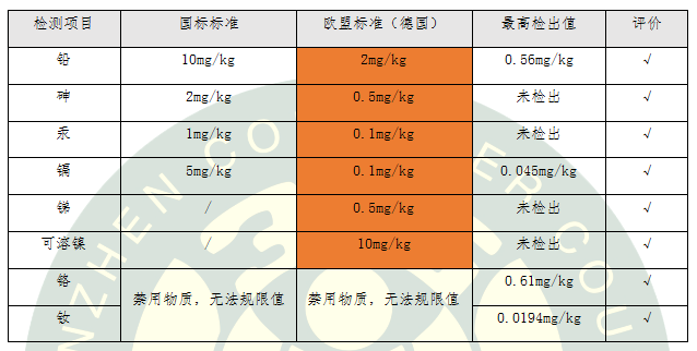 由于配方用料的特殊性,粉底类产品要比普通的面霜和乳液更容易受到重金属的污染。因此,本次比较试验不仅检测国标要求的铅、砷、汞、镉,欧盟额外要求的锑和可溶镍,还检测了我国和欧盟均禁用的铬和钕,并且,6种有限量要求的重金属均按照最严格的德国标准进行评价。