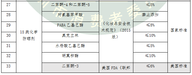 防晒化妆品在美国按非处方药(OTC)管理,新的防晒剂当作新药品来批准,审评要求非常严格。本次比较试验测试的15类化学防晒剂按照国标、欧标和美标中最严格的标准进行评价。我国允许使用的5类化学防晒剂在美国被禁止使用,还有4类化学防晒剂在美国的限量要求更加严格。