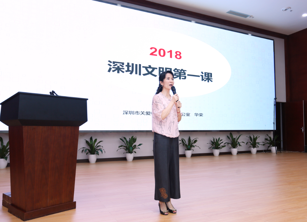 深圳市关爱办副主任华荣以详实的数据和感人的视频讲述文明第一课