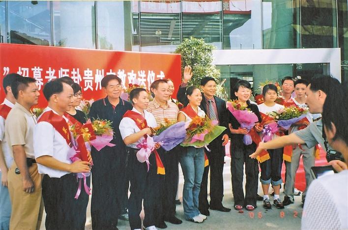 2006年,许凌峰(中间挥手者)欢送17名老师赴贵州支教。