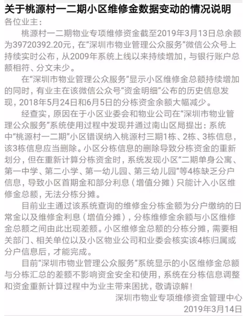 3月18日,南山区住房和建设局通过深圳论坛进行公开回应,称经向市物业专项维修资金管理中心查询,原因在于桃源村三期1栋、2栋、3栋信息删除及分栋资金的重新划分,以致小区首期维修金和部分利息(增长分摊)只能计入小区维修金总额,无法分栋分摊。