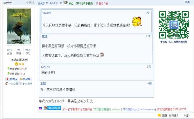 记者从问政平台得知,5月底以来,还有市民发帖反映,除华润万家外,科技园万象天地华润Ole、侨香路沃尔玛等超市也存在不提供纸质购物小票的情况。目前,市民仍然普遍认同超市应主动提供纸质购物小票,避免顾客被价格欺诈。有市民表示:“遇到最多的是优惠打折,实际还是原价买单,这时,手中有小票一目了然,不花冤枉钱。”还有市民质疑,“奸商,动不动就打着环保这些高大上的理由作借口”。同时,也有市民体验过微信小票后表示,“沃尔玛手机扫码付款是没有纸票,购物小票藏在微信公众号里,退换货就在那里面进行。这就是科技发达带来的丰硕成果,挺好的。”截至记者发稿时,市民关于科技园万象天地华润Ole、侨香路沃尔玛等超市不提供购物小票的帖文还没有得到相关部门回应。