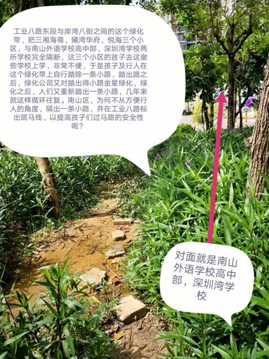 南山区蛇口街道办就此事回应称,街道已要求园林绿化公司对该处加强监管,及时补植踩出的空地。同时提醒市民朋友,遵守交通规则,不要违法穿越绿化带。在交通部门尚未做好规划前,通行沿交通路口斑马线行走。