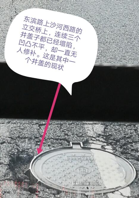 东滨路上沙河西路的立交桥上井盖凹凸不平(供图者@syh19667288)